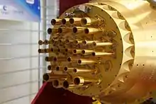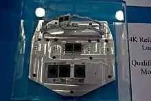 The HFI was sensitive between 100 and 857 GHz, using 52 bolometric detectors, manufactured by JPL/Caltech,[6] optically coupled to the telescope through cold optics, manufactured by Cardiff University's School of Physics and Astronomy,[7] consisting of a triple horn configuration and optical filters, a similar concept to that used in the Archeops balloon-borne experiment. These detection assemblies are divided into 6 frequency bands (centred at 100, 143, 217, 353, 545 and 857 GHz), each with a bandwidth of 33%. Of these six bands, only the lower four have the capability to measure the polarisation of incoming radiation; the two higher bands do not.[2]