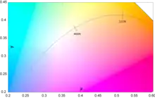 The mathematical procedure for determining the correlated color temperature involves finding the closest point to the light source's white point on the Planckian locus. Since the CIE's 1959 meeting in Brussels, the Planckian locus has been computed using the CIE 1960 color space, also known as MacAdam's (u,v) diagram.[6] Today, the CIE 1960 color space is deprecated for other purposes:[7]