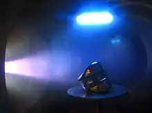 When the substrate is biased to a negative voltage (few KV's), the resultant electric field drives electrons away from the substrate in the time scale of the inverse electron plasma frequency ωe−1 ( ~ 10−9 sec). Thus an ion matrix Debye sheath[2][4] which is depleted of electrons forms around it. The negatively biased substrate will accelerate the ions within a time scale of the inverse ion plasma frequency ωi−1 ( ~ 10−6 sec). This ion movement lowers the ion density in the bulk, which causes the sheath-plasma boundary to expand in order to sustain the applied potential drop, in the process exposing more ions. The plasma sheath expands until either a steady-state condition is reached, which is called Child Langmuir law limit; or the high voltage is switched off as in the case of Pulsed DC biasing. Pulse biasing is preferred over DC biasing because it creates less damage during the pulse ON time and neutralization of unwanted charges accumulated on the wafer in the afterglow period (i.e. after the pulse has ended). In case of pulsed biasing the TON time of the pulse is generally kept at 20-40 µs, while the TOFF is kept at 0.5-2 ms i.e. a duty cycle of 1-8%. The power supply used is in range of 500 V to hundreds of KV and the pressure in the range of 1-100 mTorr.[4] This is the basic principle of the operation of immersion type PIII.