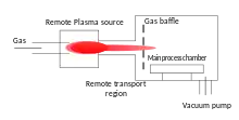 Plasma afterglow has shown to be an effective means of cleaning and sterilizing difficult to take apart machinery and glassware.[10][11] Plasma cleaning uses remote plasma sources to generate an afterglow that is ventilated into the system to be cleaned and then the afterglow ions react with the contaminants. When oxygen is used as the carrier gas, ionized oxygen species react with heavier organic compounds to form H2O, CO2, and CO. These products are then easily vented from the system effectively removing organic contaminants from the system.[12] This provides the advantage of not having to take systems apart and thus saves time on disassembly and on vacuum systems it saves time changing the pressure of the system.