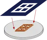 Plasmonic contact lithography, a modification on the evanescent near-field lithography, uses a metal photomask, on which the SPPs are excited. Similar to common photolithographic processes, photoresist is exposed to SPPs that propagate from the mask. Photomasks with holes enable grating coupling of SPPs; the fields only propagate for nanometers.[1][3] Srituravanich et al. has demonstrated the lithographic process experimentally with a 2D silver hole array mask; 90 nm hole arrays were produced at 365 nm wavelength, which is beyond diffraction limit.[4] Zayats and Smolyaninov utilized a multi-layered metal film mask to enhance the subwavelength aperture; such structures can be realized by thin film deposition methods. Bowtie apertures and nanogaps were also suggested as alternative apertures.[1] A version of the method, named as surface plasmon interference nanolithography by Liu et al., uses SPP interference patterns.[5] Despite offering high resolution and throughput, plasmonic contact lithography is regarded as an expensive and complex method; contamination due to contact is also a limiting factor.[1]