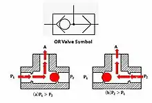 An OR valve generally uses two valve actuators (push buttons). When either button is pressed, the air flow takes place. This is also called a shuttle valve.