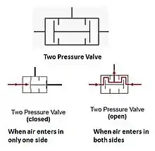 A two pressure valve generally uses two valve actuators (push buttons). When both buttons are pressed at the same time, air flows through the valve, but if either button is released, the air flow stops. They are generally used in mechanical presses and machine tools to ensure that both of the operator's hands are outside the machine or press during operation.