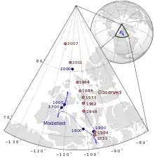 Polar wander is the motion of a pole in relation to some reference frame. It can be used, for example, to measure the degree to which Earth's magnetic poles have been observed to move relative to the Earth's rotation axis. It is also possible to use continents as reference and observe the relative motion of the magnetic pole relative to the different continents; by doing so, the relative motion of those two continents to each other can be observed over geologic time[1] as paleomagnetism.