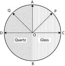A biquartz polarimeter uses a biquartz plate, consisting of two semicircular plates of quartz, each of thickness 3.75mm. One half consists of right-handed optically active quartz, while the other is left-handed optically active quartz.