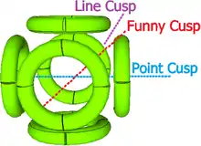 In high beta conditions, the machine may operate with cusp confinement.[12] This is an improvement over the simpler magnetic mirror.[13] The MaGrid has six point cusps, each located in the middle of a ring; and two highly modified line cusps, linking the eight corner cusps located at cube vertices. The key is that these two line cusps are much narrower than the single line cusp in magnetic mirror machines, so the net losses are less. The two line cusps losses are similar to or lower than the six face-centered point cusps.[14] In 1955, Harold Grad theorized that a high-beta plasma pressure combined with a cusped magnetic field would improve plasma confinement.[5] A diamagnetic plasma rejects the external fields and plugs the cusps. This system would be a much better trap.
