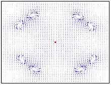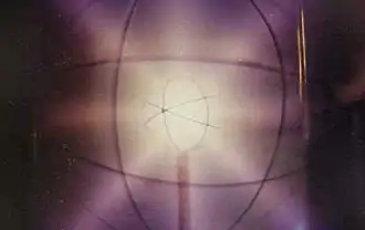 As an electron enters a magnetic field, it feels a Lorentz force and corkscrews. The radius of this motion is the gyroradius. As it moves it loses some energy as x-rays, every time it changes speed. The electron spins faster and tighter in denser fields, as it enters the MaGrid. Inside the MaGrid, single electrons travel straight through the null point, due to their infinite gyroradius in regions of no magnetic field. Next, they head towards the edges of the MaGrid field and corkscrew tighter along the denser magnetic field lines.[17][26] This is typical electron cyclotron resonance motion. Their gyroradius shrinks and when they hit a dense magnetic field they can be reflected using the magnetic mirror effect.[27][28][29] Electron trapping has been measured in polywells with Langmuir probes.[21][22][4]