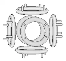 - A set of positively charged electromagnet coils arranged in a polyhedron. The most common arrangement is a six sided cube. The six magnetic poles are pointing in the same direction toward the center. The magnetic field vanishes at the center by symmetry, creating a null point.