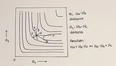 The concept of a potential energy surface for chemical reactions was first suggested by the French physicist René Marcelin in 1913.[18] The first semi-empirical calculation of a potential energy surface was proposed for the H + H2 reaction by Henry Eyring and Michael Polanyi in 1931. Eyring used potential energy surfaces to calculate reaction rate constants in the transition state theory in 1935.