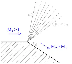 The expansion fan consists of an infinite number of expansion waves or Mach lines.[4] The first Mach line is at an angle with respect to the flow direction, and the last Mach line is at an angle with respect to final flow direction. Since the flow turns in small angles and the changes across each expansion wave are small, the whole process is isentropic.[1] This simplifies the calculations of the flow properties significantly. Since the flow is isentropic, the stagnation properties like stagnation pressure (), stagnation temperature () and stagnation density () remain constant. The final static properties are a function of the final flow Mach number () and can be related to the initial flow conditions as follows, where is the heat capacity ratio of the gas (1.4 for air):