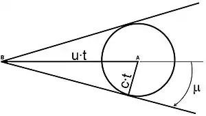 For an object moving at supersonic speeds () as it moves from point A to B (distance u·t), the disturbances originating from point A travel a distance c·t. The corresponding angle is known as a Mach angle and the lines enclosing the disturbed region are known as Mach lines (in 2-D case) or Mach cone (in 3-D). - Landau, L. D., & Lifshitz, E. M. (2013). Fluid Mechanics: Landau and Lifshitz: Course of Theoretical Physics, Volume 6 (Vol. 6). Elsevier.