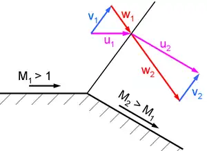 Impossibility of expanding a flow through a single "shock" wave: Consider the scenario shown in the adjacent figure. As a supersonic flow turns, the normal component of the velocity increases (), while the tangential component remains constant (). The corresponding change is the entropy () can be expressed as follows,