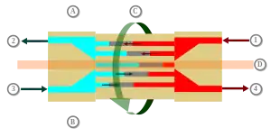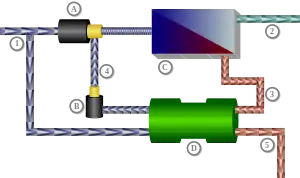 One application in which pressure exchangers are widely used is reverse osmosis (RO). In an RO system, pressure exchangers are used as energy recovery devices (ERDs). As illustrated, high-pressure concentrate from the membranes [C] is directed [3] to the ERD [D]. The ERD uses this high-pressure concentrate stream to pressurize the low-pressure seawater stream (stream [1] becomes stream [4]), which it then merges (with the aid of a circulation pump [B]) into the highest-pressure seawater stream created by the high-pressure pump [A]. This combined stream feeds the membranes [C]. The concentrate leaves the ERD at low pressure [5], expelled by the incoming feedwater flow [1].