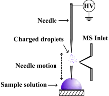 The PESI ion source consists of a solid needle or wire which acts as both the sampling probe and electrospray emitter.[5] The needle is moved up and down along a vertical axis, a process which can be either automated or manual. When the needle is lowered to the sampling stage, the tip of the needle briefly touches the surface of a typical liquid sample. During this stage, the needle is held at ground potential. The needle is then raised to be level with the mass spectrometer inlet where a high voltage of 2–3 kV is applied. Electrospray is induced at the tip of the needle, producing analyte ions which are drawn into the mass spectrometer for analysis. The mechanism by which ions are formed is believed to be identical to traditional electrospray ionization. As a result, in positive ion mode analytes are often observed as the protonated, sodiated and potentiated ions, depending on the sample and analyte type.