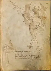 Around 1420 the Venetian scholar and engineer Giovanni Fontana included a drawing of a person with a lantern projecting an image of a demon in his book about mechanical instruments "Bellicorum Instrumentorum Liber".[16] The Latin text "Apparentia nocturna ad terrorem videntium" (Nocturnal appearance to frighten spectators)" clarifies its purpose, but the meaning of the undecipherable other lines is unclear. The lantern seems to simply have the light of an oil lamp or candle go through a transparent cylindrical case on which the figure is drawn to project the larger image, so it probably couldn't project an image as clearly defined as Fontana's drawing suggests.