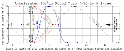 These equations describe some consequences of accelerated travel at high speed. For example, imagine a spaceship that can accelerate its passengers at 1 g (or 1.03 lightyears/year2) halfway to their destination, and then decelerate them at 1 g for the remaining half so as to provide Earth-like artificial gravity from point A to point B over the shortest possible time. For a map distance of ΔxAB, the first equation above predicts a midpoint Lorentz factor (up from its unit rest value) of γmid=1+α(ΔxAB/2)/c2. Hence the round-trip time on traveler clocks will be Δτ = 4(c/α)cosh−1[γmid], during which the time elapsed on map clocks will be Δt = 4(c/α)sinh[cosh−1[γmid]].