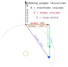 Unlike the more familiar coordinate velocity v, proper velocity is synchrony-free[1] (does not require synchronized clocks) and is useful for describing both super-relativistic and sub-relativistic motion. Like coordinate velocity and unlike four-vector velocity, it resides in the three-dimensional slice of spacetime defined by the map frame. As shown below and in the example figure at right, proper-velocities even add as three vectors with rescaling of the out-of-frame component. This makes them more useful for map-based (e.g. engineering) applications, and less useful for gaining coordinate-free insight. Proper speed divided by lightspeed c is the hyperbolic sine of rapidity η, just as the Lorentz factor γ is rapidity's hyperbolic cosine, and coordinate speed v over lightspeed is rapidity's hyperbolic tangent.