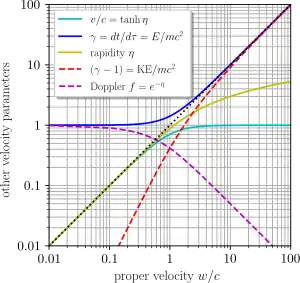 | Condition/Parameter | Coordinate velocity v dx/dt in units of c | Velocity angle η in i-radians | Proper velocity w dx/dτ in units of c | Lorentz factor γ dt/dτ = E/mc2 |