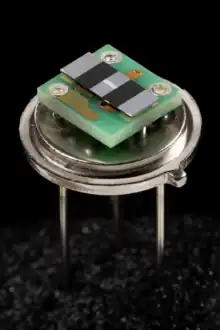 Progress has been made in creating artificial pyroelectric materials, usually in the form of a thin film, using gallium nitride (GaN), caesium nitrate (CsNO3), polyvinyl fluorides, derivatives of phenylpyridine, and cobalt phthalocyanine. Lithium tantalate (LiTaO3) is a crystal exhibiting both piezoelectric and pyroelectric properties, which has been used to create small-scale nuclear fusion ("pyroelectric fusion").[20] Recently, pyroelectric and piezoelectric properties have been discovered in doped hafnium oxide (HfO2), which is a standard material in CMOS manufacturing.[21]