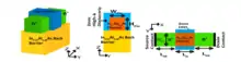 Modern examples of quantum field-effect transistors integrate structures traditional to conventual MOSFETs and utilize many of the same materials.[5] MOSFET transistors consist of dielectric materials, such as SiO2, and metal gates.[6] The metal gates are insulated from the gate dielectric layer, which leads to a very high input resistance.[7] Consisting of three terminals, the source (or input), drain (or output), and gate, MOSFETs can control current flow via an applied voltage (or lack thereof) to the gate terminal, which alters the potential barrier between the layers and enables (or disables) charge flow.[8]