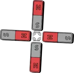 An example of a magnetic quadrupole, involving permanent magnets, is depicted on the right. Electromagnets of similar conceptual design (called quadrupole magnets) are commonly used to focus beams of charged particles in particle accelerators and beam transport lines, a method known as strong focusing. There are four steel pole tips, two opposing magnetic north poles and two opposing magnetic south poles. The steel is magnetized by a large electric current that flows in the coils of tubing wrapped around the poles.