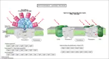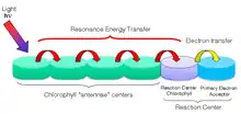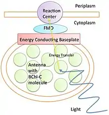 Photosynthesis refers to the biological process that photosynthetic cells use to synthesize organic compounds from inorganic starting materials using sunlight.[58] What has been primarily implicated as exhibiting non-trivial quantum behaviors is the light reaction stage of photosynthesis. In this stage, photons are absorbed by the membrane-bound photosystems. Photosystems contain two major domains, the light-harvesting complex (antennae) and the reaction center. These antennae vary among organisms. For example, bacteria use circular aggregates of chlorophyll pigments, while plants use membrane-embedded protein and chlorophyll complexes.[59][60] Regardless, photons are first captured by the antennae and passed on to the reaction-center complex. Various pigment-protein complexes, such as the FMO complex in green sulfur bacteria, are responsible for transferring energy from antennae to reaction site. The photon-driven excitation of the reaction-center complex mediates the oxidation and the reduction of the primary electron acceptor, a component of the reaction-center complex. Much like the electron transport chain of the mitochondria, a linear series of oxidations and reductions drives proton (H+) pumping across the thylakoid membrane, the development of a proton motive force, and energetic coupling to the synthesis of ATP.
