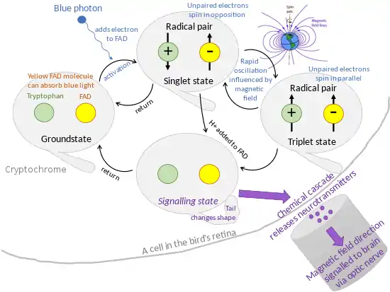 Magnetoreception is the ability of animals to navigate using the inclination of the magnetic field of the Earth.[96] A possible explanation for magnetoreception is the entangled radical pair mechanism.[97][98] The radical-pair mechanism is well-established in spin chemistry,[99][100][101] and was speculated to apply to magnetoreception in 1978 by Schulten et al.. The ratio between singlet and triplet pairs is changed by the interaction of entangled electron pairs with the magnetic field of the Earth.[102] In 2000, cryptochrome was proposed as the "magnetic molecule" that could harbor magnetically sensitive radical-pairs. Cryptochrome, a flavoprotein found in the eyes of European robins and other animal species, is the only protein known to form photoinduced radical-pairs in animals.[96] When it interacts with light particles, cryptochrome goes through a redox reaction, which yields radical pairs both during the photo-reduction and the oxidation. The function of cryptochrome is diverse across species, however, the photoinduction of radical-pairs occurs by exposure to blue light, which excites an electron in a chromophore.[102] Magnetoreception is also possible in the dark, so the mechanism must rely more on the radical pairs generated during light-independent oxidation.
