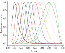 Quantum dots have properties intermediate between bulk semiconductors and discrete atoms or molecules. Their optoelectronic properties change as a function of both size and shape.[9][10] Larger QDs of 5–6 nm diameter emit longer wavelengths, with colors such as orange, or red. Smaller QDs (2–3 nm) emit shorter wavelengths, yielding colors like blue and green. However, the specific colors vary depending on the exact composition of the QD.[11]