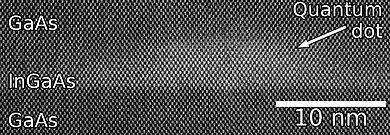 Atomic resolution scanning transmission electron microscopy image of an indium gallium arsenide (InGaAs) quantum dot buried in gallium arsenide (GaAs)