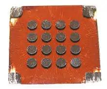 Spin-cast quantum dot solar cell built by the Sargent Group at the University of Toronto. The metal disks on the front surface are the electrical connections to the layers below.