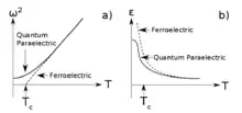 Quantum paraelectricity[1] is a type of incipient ferroelectricity where the onset of ferroelectric order is suppressed by quantum fluctuations.[2] From the soft mode theory of ferroelectricity,[3] this occurs when a ferroelectric instability is stabilized by quantum fluctuations. In this case the soft-mode frequency never becomes unstable (Fig. 1a) as opposed to a regular ferroelectric.