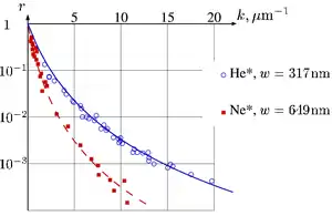 In the experiments with Ne atoms, usually just fall down, when the MOT is suddenly switched off. Then, the speed of atoms is determined as , where is acceleration of free fall, and is distance from the MOT to the sample. In experiments described, this distance was of order of 0.5 meters (2 ft), providing the speed of order of 3 m/s (6.7 mph; 11 km/h). Then, the transversal wavenumber can be calculated as , where is mass of the atom, and is the Planck constant.