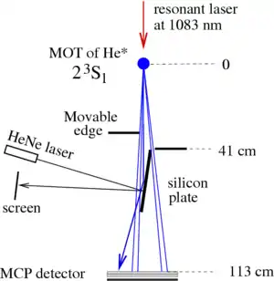 In the case with He, the additional resonant laser could be used to release the atoms and provide them an additional velocity; the delay since the release of the atoms till the registration allowed to estimate this additional velocity; roughly, , where is time delay since the release of atoms till the click at the detector. Practically, could vary from 20 to 130 m/s (45 to 291 mph; 72 to 468 km/h).[8][9][10]