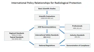 The ICRP's recommendations flow down to national and regional regulators, which have the opportunity to incorporate them into their own law; this process is shown in the accompanying block diagram. In most countries a national regulatory authority works towards ensuring a secure radiation environment in society by setting dose limitation requirements that are generally based on the recommendations of the ICRP.