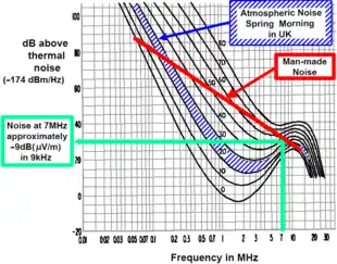 Atmospheric noise as a function of frequency in the LF, MF, and HF radio spectrum according to CCIR 322. The vertical axis is in decibels above the thermal noise floor. It can be seen that as frequency drops atmospheric noise dominates other sources.