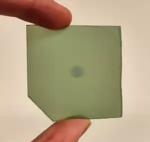 Radiochromic film is a type of self-developing film typically used in the testing and characterisation of radiographic equipment such as CT scanners and radiotherapy linacs. The film contains a dye which changes colour when exposed to ionising radiation, allowing the level of exposure and beam profile to be characterised.[1] Unlike x-ray film no developing process is required and results can be obtained almost instantly, while it is insensitive to visible light (making handling easier).[2]
