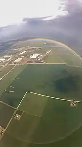 In theory, every rainbow is a circle, but from the ground, usually only its upper half can be seen. Since the rainbow's centre is diametrically opposed to the Sun's position in the sky, more of the circle comes into view as the sun approaches the horizon, meaning that the largest section of the circle normally seen is about 50% during sunset or sunrise. Viewing the rainbow's lower half requires the presence of water droplets below the observer's horizon, as well as sunlight that is able to reach them. These requirements are not usually met when the viewer is at ground level, either because droplets are absent in the required position, or because the sunlight is obstructed by the landscape behind the observer. From a high viewpoint such as a high building or an aircraft, however, the requirements can be met and the full-circle rainbow can be seen.[33][34] Like a partial rainbow, the circular rainbow can have a secondary bow or supernumerary bows as well.[35] It is possible to produce the full circle when standing on the ground, for example by spraying a water mist from a garden hose while facing away from the sun.[36]