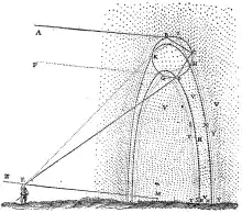 According to Hüseyin Gazi Topdemir, the Arab physicist and polymath Ibn al-Haytham (Alhazen; 965–1039), attempted to provide a scientific explanation for the rainbow phenomenon. In his Maqala fi al-Hala wa Qaws Quzah (On the Rainbow and Halo), al-Haytham "explained the formation of rainbow as an image, which forms at a concave mirror. If the rays of light coming from a farther light source reflect to any point on axis of the concave mirror, they form concentric circles in that point. When it is supposed that the sun as a farther light source, the eye of viewer as a point on the axis of mirror and a cloud as a reflecting surface, then it can be observed the concentric circles are forming on the axis." He was not able to verify this because his theory that "light from the sun is reflected by a cloud before reaching the eye" did not allow for a possible experimental verification.[68] This explanation was repeated by Averroes, and, though incorrect, provided the groundwork for the correct explanations later given by Kamāl al-Dīn al-Fārisī in 1309 and, independently, by Theodoric of Freiberg (c. 1250–c. 1311)—both having studied al-Haytham's Book of Optics.[69]