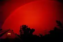 Occasionally a shower may happen at sunrise or sunset, where the shorter wavelengths like blue and green have been scattered and essentially removed from the spectrum. Further scattering may occur due to the rain, and the result can be the rare and dramatic monochrome or red rainbow.[44]