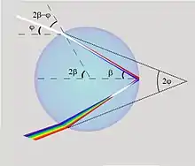 Given a spherical raindrop, and defining the perceived angle of the rainbow as 2φ, and the angle of the internal reflection as 2β, then the angle of incidence of the Sun's rays with respect to the drop's surface normal is 2β − φ. Since the angle of refraction is β, Snell's law gives us