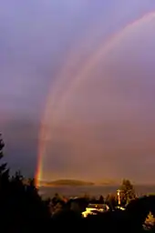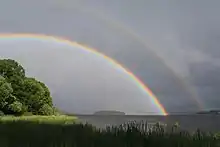 A reflected rainbow may appear in the water surface below the horizon.[41] The sunlight is first deflected by the raindrops, and then reflected off the body of water, before reaching the observer. The reflected rainbow is frequently visible, at least partially, even in small puddles.