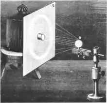Experiments on the rainbow phenomenon using artificial raindrops, i.e. water-filled spherical flasks, go back at least to Theodoric of Freiberg in the 14th century. Later, also Descartes studied the phenomenon using a Florence flask. A flask experiment known as Florence's rainbow is still often used today as an imposing and intuitively accessible demonstration experiment of the rainbow phenomenon.[82][83][84] It consists in illuminating (with parallel white light) a water-filled spherical flask through a hole in a screen. A rainbow will then appear thrown back / projected on the screen, provided the screen is large enough. Due to the finite wall thickness and the macroscopic character of the artificial raindrop, several subtle differences exist as compared to the natural phenomenon,[85][86] including slightly changed rainbow angles and a splitting of the rainbow orders.