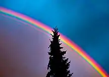 A rainbow is an optical phenomenon caused by refraction, internal reflection and dispersion of light in water droplets resulting in a continuous spectrum of light appearing in the sky.[1] The rainbow takes the form of a multicoloured circular arc.[2] Rainbows caused by sunlight always appear in the section of sky directly opposite the Sun. Rainbows can be caused by many forms of airborne water. These include not only rain, but also mist, spray, and airborne dew.