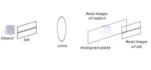 Figure 2 shows an optical arrangement for making a rainbow hologram. The object is illuminated with laser light (not shown in the diagram), and an image is formed in the plane of the hologram plate used to record the hologram. A narrow horizontal slit is placed between the object and the lens. The hologram plate is also illuminated with a reference beam derived from the same laser (not shown in the diagram), and the interference pattern between object and reference beams is recorded.[2]