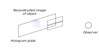 The developed hologram is illuminated by a beam similar to the original reference beam. A re-constructed image of the original real image can be seen by an observer located to the right of the hologram. However, this image will appear as if it is being viewed through the re-constructed slit to the right of the plate. This means that only a small horizontal section of the image can be seen from any one location, though if the observer changes his/her viewing position, a different part of the object can be seen. If the hologram is illuminated with a laser beam of a different wavelength, the position of the reconstructed image will change. When the hologram is illuminated with a white light source directed from the left of the hologram plate, each colour re-constructs a different part of the image at a slightly different angle, so that the whole object is now seen, but with the colour varying in the vertical direction.