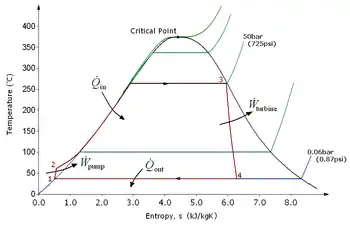 In an ideal Rankine cycle the pump and turbine would be isentropic: i.e., the pump and turbine would generate no entropy and would hence maximize the net work output. Processes 1–2 and 3–4 would be represented by vertical lines on the T–s diagram and more closely resemble that of the Carnot cycle. The Rankine cycle shown here prevents the state of the working fluid from ending up in the superheated vapor region after the expansion in the turbine, [1] which reduces the energy removed by the condensers.