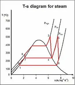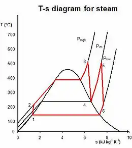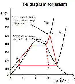 of that cycle. Increasing the temperature of the steam into the superheat region is a simple way of doing this. There are also variations of the basic Rankine cycle designed to raise the thermal efficiency of the cycle in this way; two of these are described below.