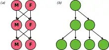 The evolution and persistence of sexual reproduction is another mystery in biology. The purpose of sexual reproduction is unclear, as in many organisms it has a 50% cost (fitness disadvantage) in relation to asexual reproduction.[52] Mating types (types of gametes, according to their compatibility) may have arisen as a result of anisogamy (gamete dimorphism), or the male and female sexes may have evolved before anisogamy.[53][54] It is also unknown why most sexual organisms use a binary mating system,[55] and why some organisms have gamete dimorphism. Charles Darwin was the first to suggest that sexual selection drives speciation; without it, complex life would probably not have evolved.
