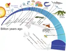 −4500 — – — – −4000 — – — – −3500 — – — – −3000 — – — – −2500 — – — – −2000 — – — – −1500 — – — – −1000 — – — – −500 — – — – 0 — | Water Single-celled life Photosynthesis Eukaryotes Multicellular life P l a n t s Arthropods Molluscs Flowers Dinosaurs Mammals Birds Primates H a d e a n A r c h e a n P r o t e r o z o i c P h a n e r o z o i c |