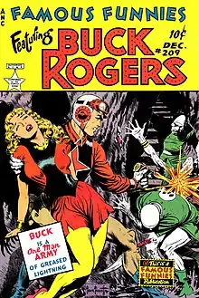 Buck Rogers using a raygun on the cover of Famous Funnies #209.